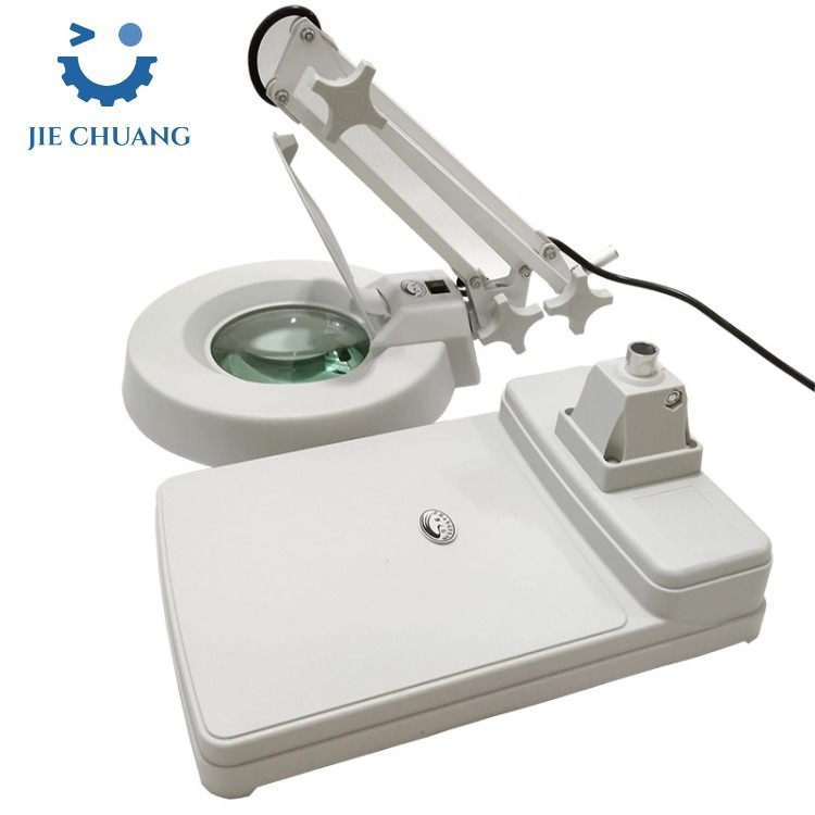 MAGNIFIER 10X TABLE TOP Size: Glass diameter 127mm Material: Glass Magnification: X10 Name:Desktop Magnifying Lamp Color:White Light: 1 LED Fluorescent Light Source:Fluorescent& LED