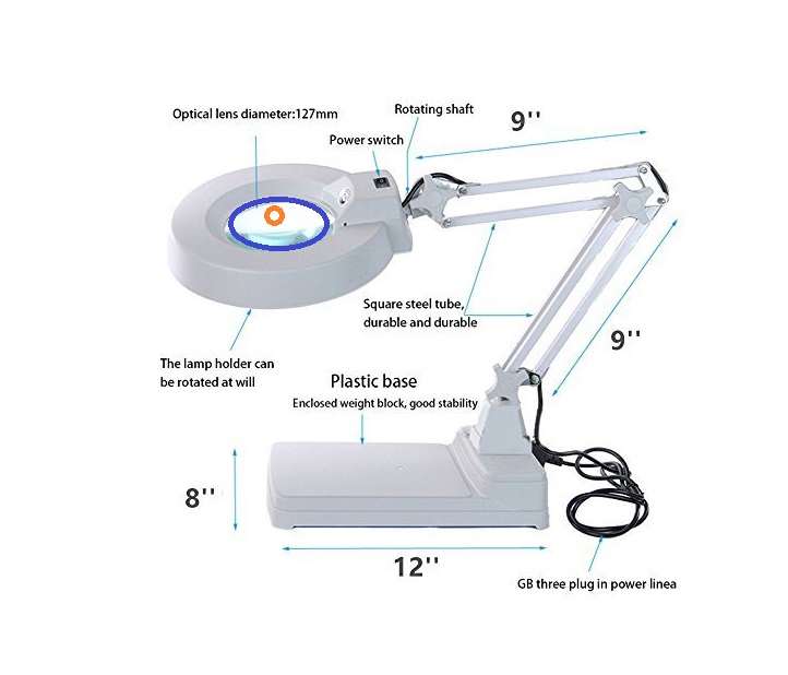 MAGNIFIER 20X TABLE TOP Size: Glass diameter 127mm Material: Glass Magnification: X20 Name:Desktop Magnifying Lamp Color:White Light: 1 LED Fluorescent Light Source:Fluorescent& LED