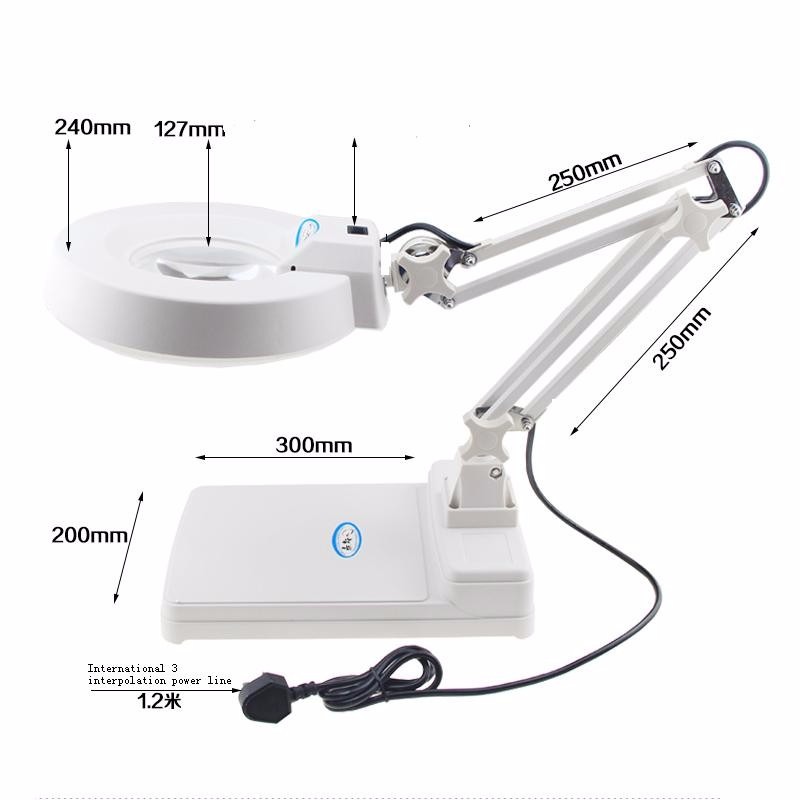 MAGNIFIER 5X TABLE TOP Size: Glass diameter 127mm Material: Glass Magnification: X5 Name:Desktop Magnifying Lamp Color:White Light: 1 LED Fluorescent Light Source:Fluorescent& LED