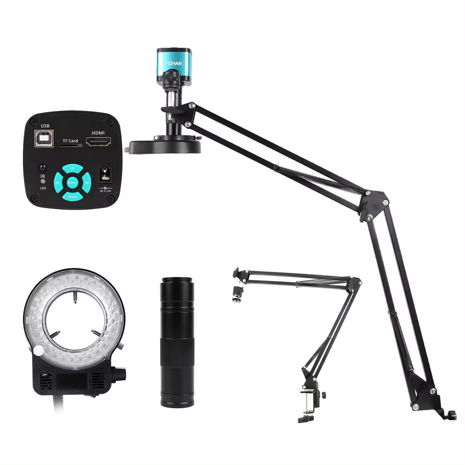 1080P HD-MI USB Industrial Camera 150x Lens Fold Bracket Remote 4K Electronic Digital Microscope for Soldering Microscope Specification: 48MP Industrial Camera Features: ◆ 48 million pixel imported Panasonic CMOS image sensor; ◆ Using 1/2.33 inch image sensor, Angle of view is wider than 1/3 inch; HD-MI 1080P 60 frame image output; ◆ USB2.0 driver free output 1080P 30 frame image output; 4K video recording; ◆ 48 million photos, JPG format, photo size 4608x3456; One-click freezing/thawing function; ◆ 48 megapixel photography and 1080P video recording; Electronic zoom function; Support manual/automatic exposure, exposure compensation value adjustment; Support manual/automatic white balance, red, green, blue adjustable; ◆ Provide 8 line drawing functions, line color, thickness, position adjustable; Display/close center cross; Support TF card storage, up to 64GB; Support remote control operation, take photos without jitter image clearer; Image resolution: 60F/S White Balance: Auto Light: Auto Negative: Support Morror: Left/right,Up/Down Freeze: Support OSD: English 56 LED Adjustable Compact Microscope Ring Light: Provides intense and focused shadow-free illumination Lighting direction changeable Variable intensity control Intense and focused shadow-free illumination 100,000 hours of life Power input: 100-240V, 50-60HZ, auto switching Inside diameter of the ring light: 1.0“ (27mm) Overall outside diameter: 1.77” (45mm) 1X-150X Zoom C-mount Lens: Working distance: 50mm-1000mm zoom ratios: 1: 15 Magnification Power by 0.15- 2X (about 1 - 150X on the display) view field of Max multiple: 4.2mm*2.4mm view field of Min multiple: 130mm*70mm Size: 30mm(diameter) * 99mm(length) Collapsible support Feature: Multi-directional folding optional installation, multi-purpose. Size: 340 mm * 320 mm Maximum bottom mounting size: 50mm Complete set Packing include: 1 x Camera 1 x power supply 1 x C-mount Lens 1 x Camera metal Stand holder 1 x 56 LED Ring Light ORIGIN: GABY INSTRUMENTS