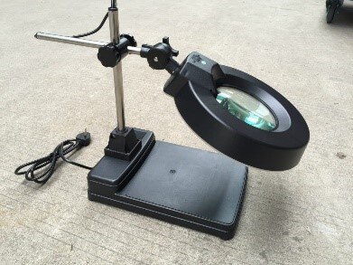 ESD DESKTOP MAGNIFYING LAMP 20X • Size: Glass diameter 127mm • Material: Glass • Magnification: X20 • Name: ESD Desktop Magnifying Lamp • Color: White • Light: 1 LED • Light Source: LED
