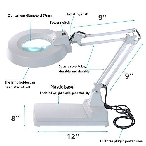 LED Magnifier Table , USB Desktop LED: 60 SMD LED lights Lens diameter: 105mm / 4.13 '' Dimming: smooth dimming; 3 color modes DC adapter: 5V 2A Feature: 1. Durable metal clip can be fixed on any plane with thickness less than 2.56 inches / 6.5 cm (maximum). It saves space and easily connects to tables and workbenches. 2. The lamp head can be adjusted up and down by 220 ° and rotated by 360 °. 22cm + 22cm telescopic long arm, adjustable 180 ° / 135 °. 3. Magnifier with LED light, the color temperature of the LED light can be adjusted in 3 levels, and the brightness can be adjusted in 11 levels, which can meet various working environments. 4. Suitable for reading job / computer board / jewelry maker / art craft enthusiast / soldering rework / skin care beauty, it can be used universally.